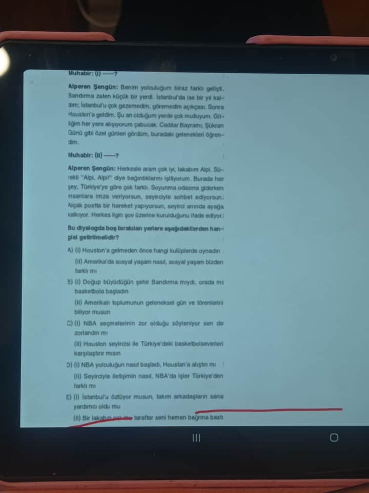 | A | Houston’a gelmeden önce hangi kulüplerde oynadın? | Amerika’da sosyal yaşam nasıl, sosyal yaşam bizden farklı mı? | (I) sorusu uygun değil çünkü Alperen Bandırma ve İstanbul’dan bahsetmiş, Houston öncesi kulüplerden bahsetmemiş. (II) sorusu sosyal yaşamla ilgili, uyuyor. |