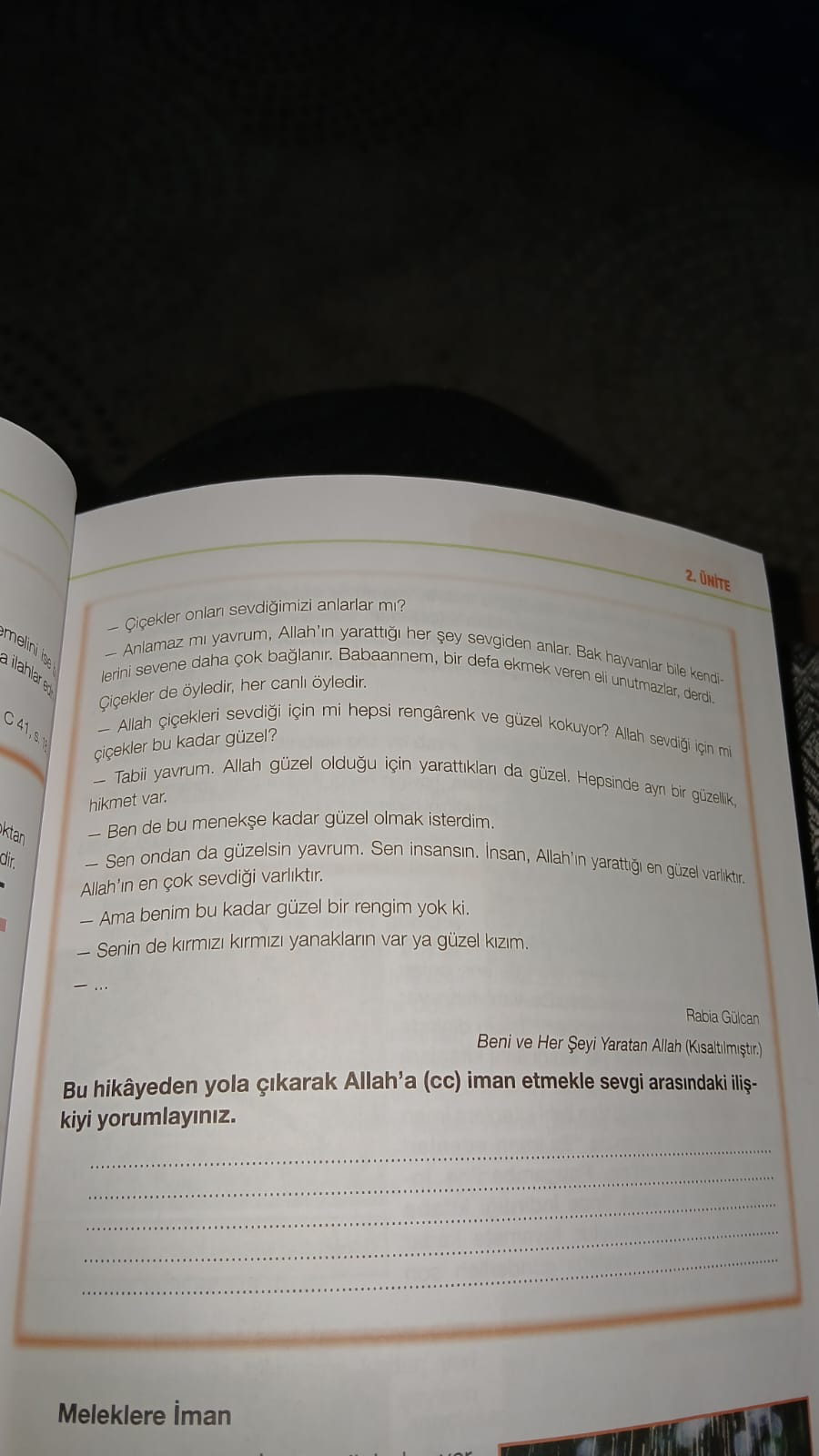 Bu kısa hikâyede anne, çiçeklerin güzelliğini anlatırken “Allah güzel olduğu için yarattıkları da güzeldir” diyerek iman ve sevgi arasındaki güçlü bağı vurguluyor. Buna dayanarak şu şekilde açıklayabiliriz: