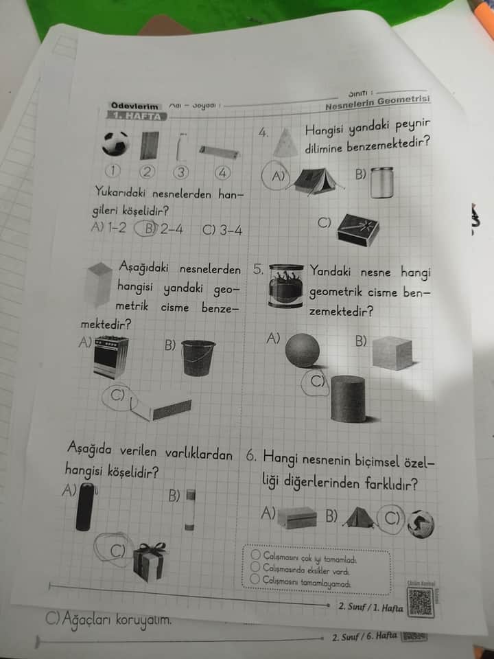 | 2 | Geometrik cisme benzeyen nesne | A | Ocak → dikdörtgenler prizması |