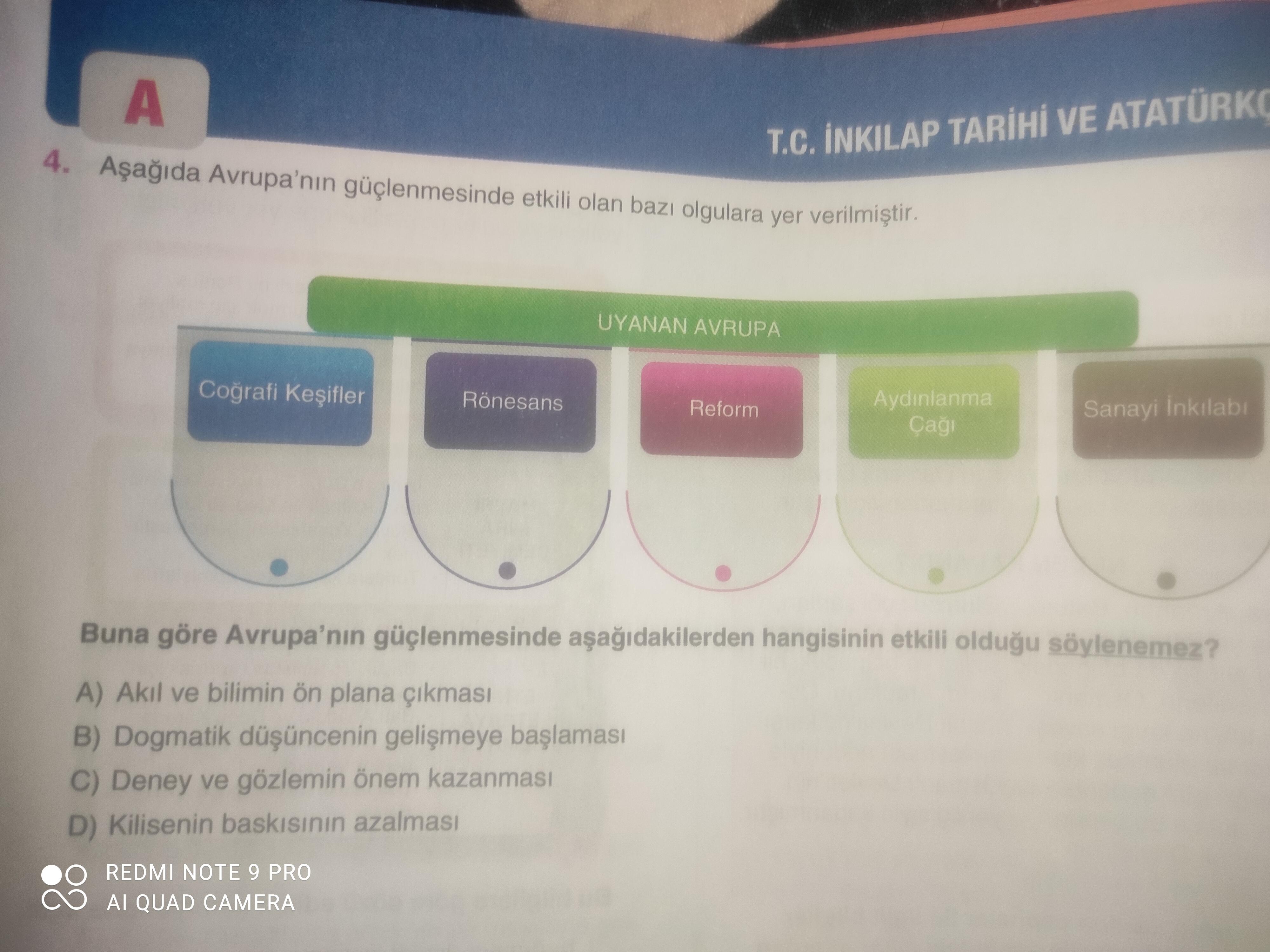 Bu soru, T.C. İnkılap Tarihi ve Atatürkçülük konusundan alınmış bir LGS tarzı sorudur. Görselde, Avrupa’nın güçlenmesini sağlayan önemli tarihsel dönüm noktaları (örneğin Coğrafi Keşifler, Rönesans, Reform, Aydınlanma Çağı, Sanayi İnkılabı) sıralanmıştır. Soru, bu gelişmelere dayanarak, “Avrupa’nın güçlenmesinde aşağıdakilerden hangisinin etkili olduğu söylenemez?” ifadesini içermektedir.