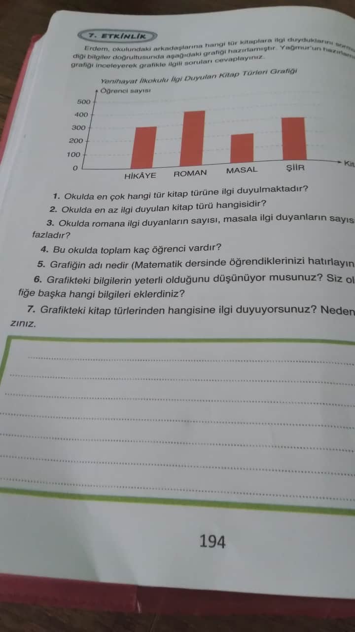 Grafikteki sütunların yüksekliklerine göre yorum yaptık. En yüksek sütun romanı, en düşük sütun masalı gösteriyor. Toplam öğrenci sayısı da bütün sütunların toplamıdır.