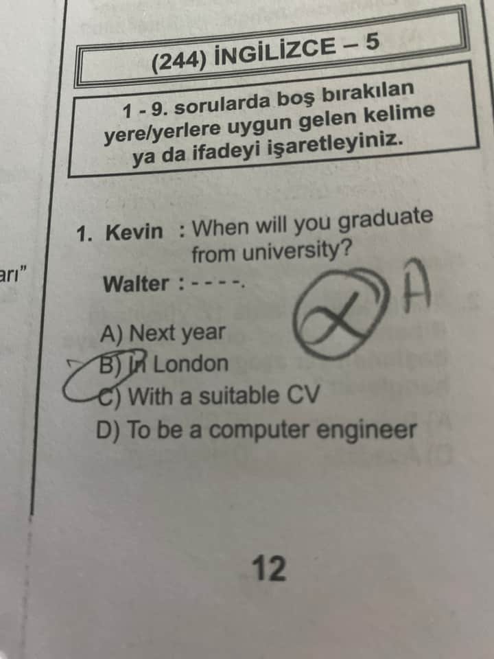 Bu soruda Kevin, Walter’a “Üniversiteden ne zaman mezun olacaksın?” diye soruyor. Buna cevap olarak zamana veya döneme yönelik bir ifade beklenir.