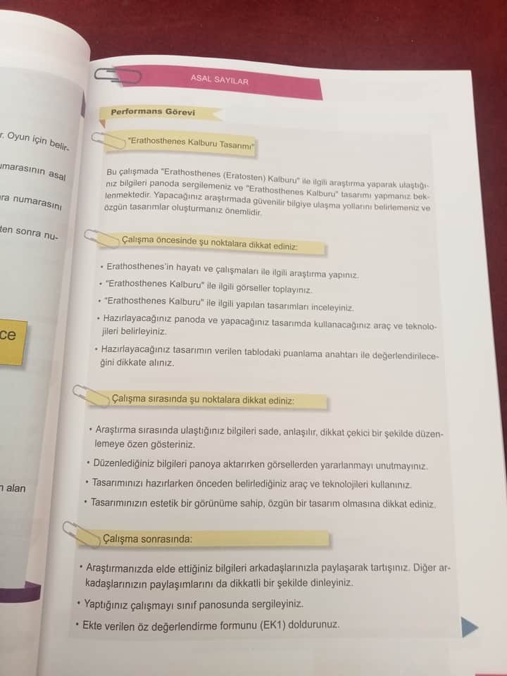 | Çalışma Öncesinde Dikkat Edilecekler | - Eratosthenes’in hayatı ve çalışmaları hakkında araştırma yapınız. - Kalbur ile ilgili görseller toplayınız. - Yapılan tasarımları inceleyiniz. - Kullanılacak araç ve teknolojileri belirleyiniz. - Tasarımınız, puanlama anahtarına göre değerlendirilecektir. |
