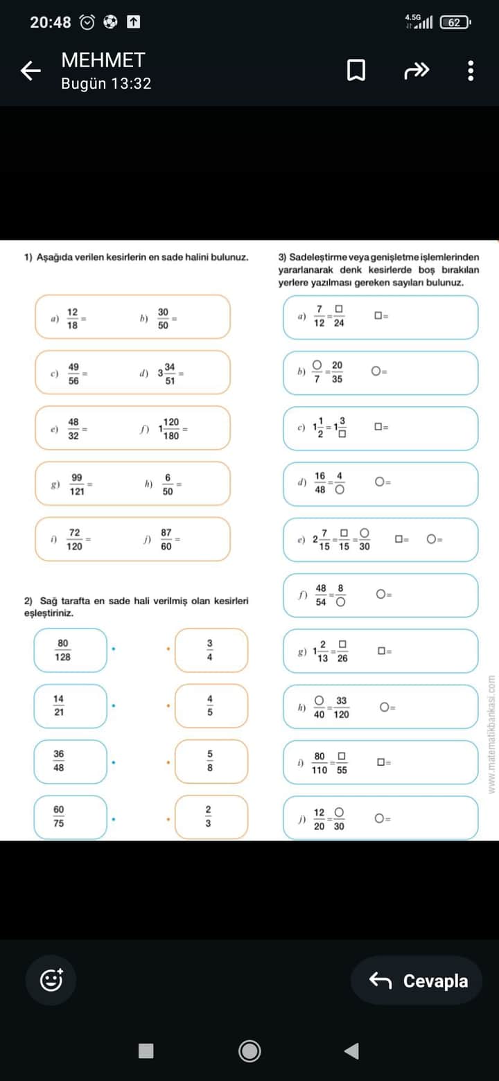 | e) | \frac{48}{32} | 48 ve 32’nin EBOB’u 16 | \frac{48 \div 16}{32 \div 16} = \frac{3}{2} |