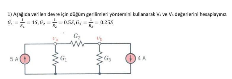 1) Aşağıda verilen devre için düğüm gerilimleri yöntemini kullanarak Va ve Vb değerlerini hesaplayınız. G1=1 S, G2=0.5 S, G3=0.25 S