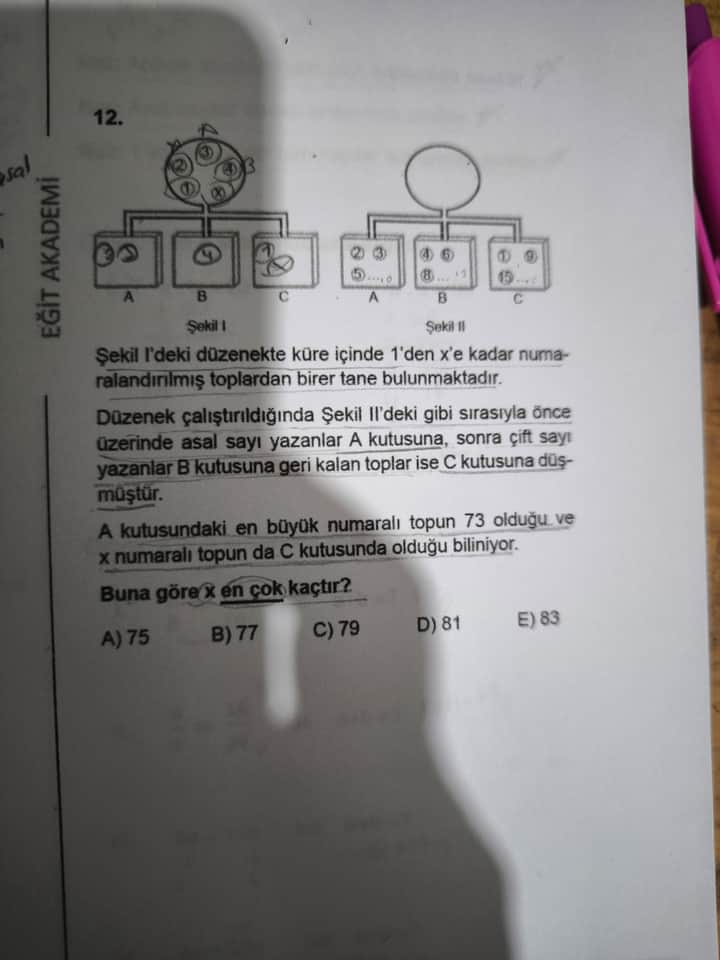 Şekil I’deki düzenekte küre içinde 1’den x’e kadar numaralandırılmış toplardan birer tane bulunmaktadır. Düzenek çalıştırıldığında Şekil II’deki gibi sırasıyla önce üzerinde asal sayı yazanlar A kutusuna, sonra çift sayı yazanlar B kutusuna, geri kalan toplar ise C kutusuna düşmüştür.