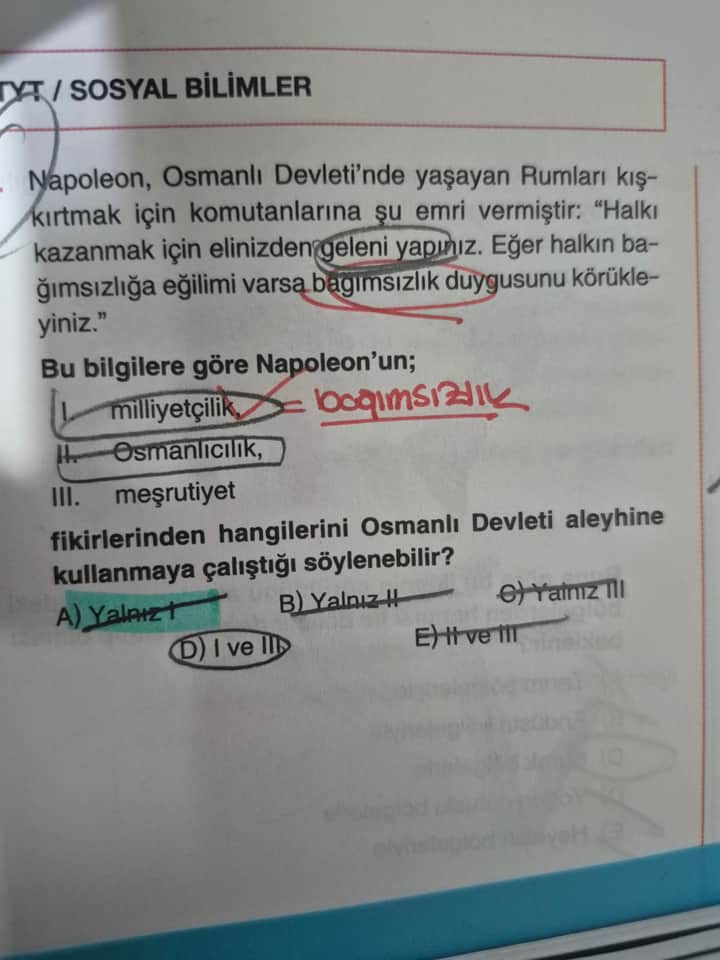 Napoleon’un “Rum halkının bağımsızlık duygusunu körükleyin” şeklindeki emri, milliyetçilik (I) fikrinin Osmanlı Devleti aleyhine kullanıldığını göstermektedir. Osmanlıcılık veya meşrutiyetle ilgili doğrudan hiçbir vurgu yoktur. Bu sebeple doğru cevap Yalnız I seçeneğidir.