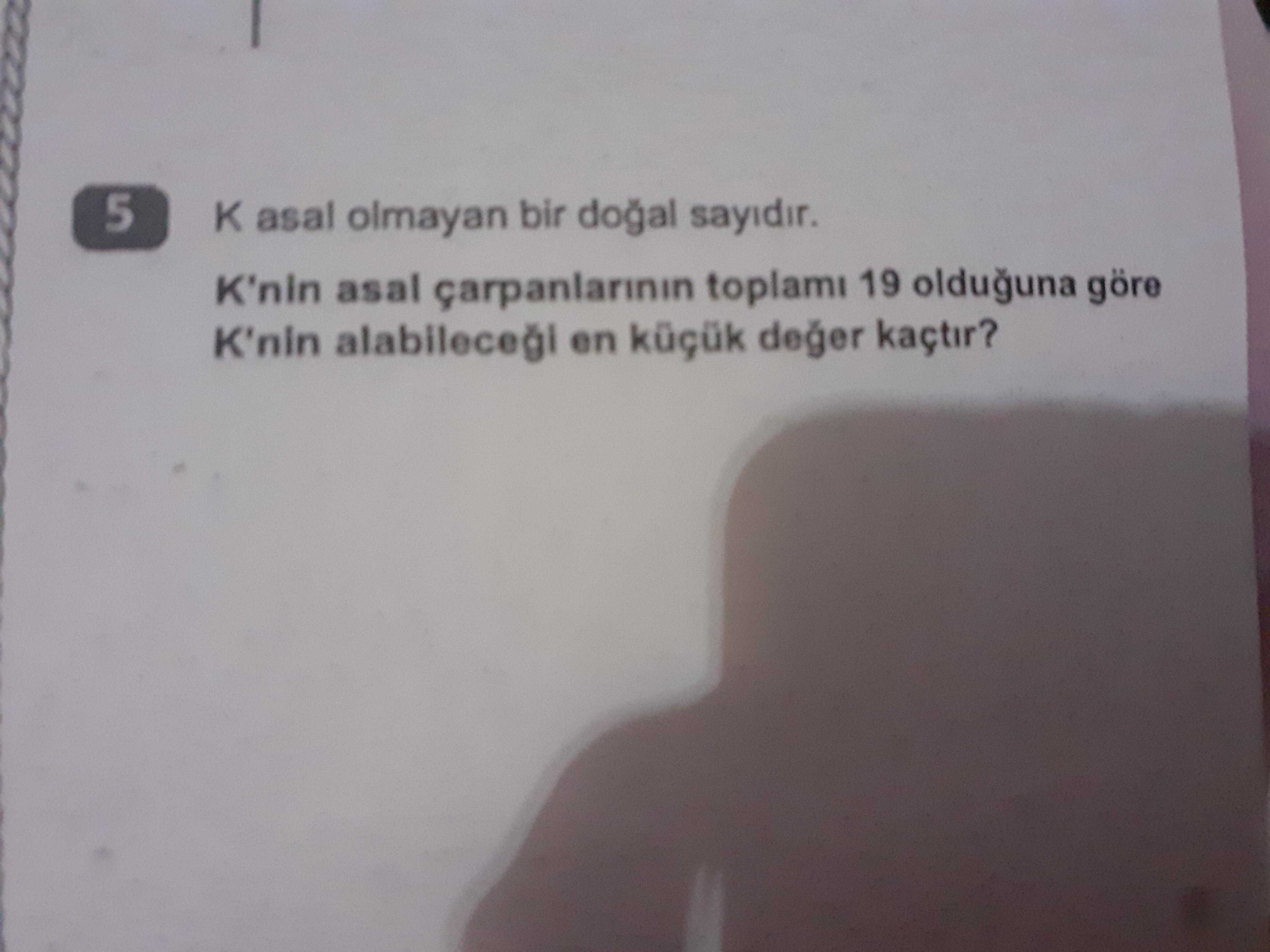 K asal olmayan bir doğal sayıdır. K’nın asal çarpanlarının toplamı 19 olduğuna göre K’nın alabileceği en küçük değer kaçtır?