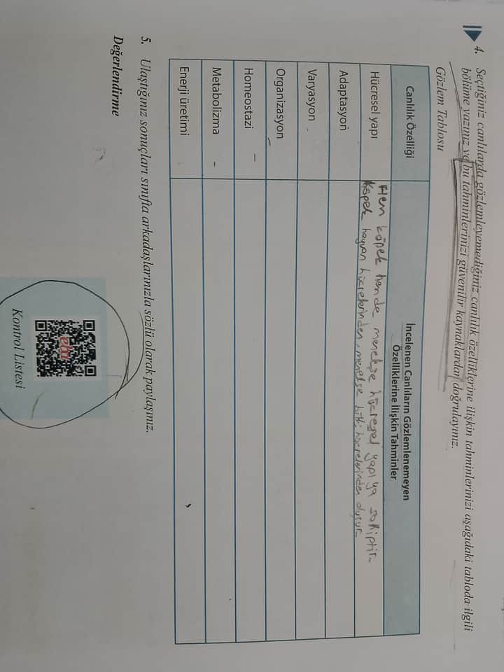 Merhaba Bahar, gözlemlediğin organizmaların henüz doğrudan gözlemleyemediğin canlılık özellikleri için aşağıdaki tahminleri kullanabilirsin. Her bir özellik için, gözlemlerine dayanarak mantıklı çıkarımlar yapmaya çalıştım: