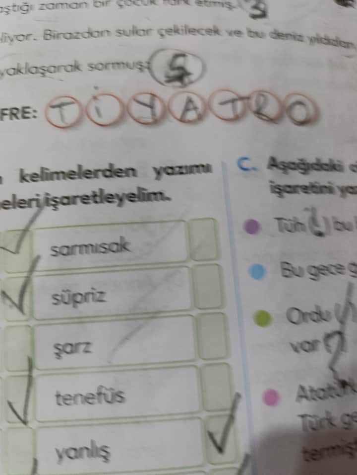 Resimde bir kutucukta bazı kelimeler ve onların doğru/yanlış şeklinde işaretlenme durumu görünmektedir. Listeye göre verilen işaretler şu şekilde: