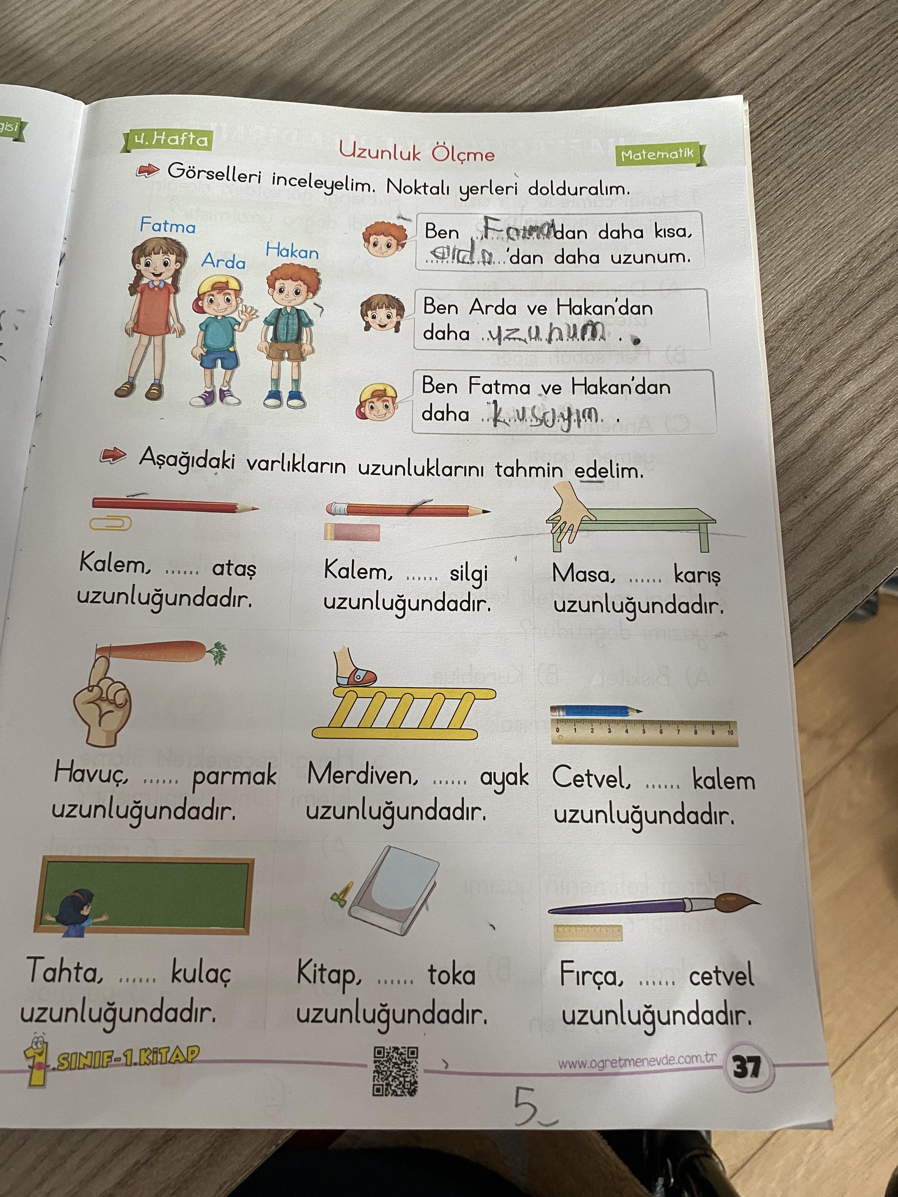 Yukarıdaki görselde yer alan ölçme etkinliğinde, önce insanlar arasındaki boy farklarını belirterek uygun şekilde cümleleri doldurmanız, ardından çeşitli eşyaların tahmini uzunluklarını (kısa, uzun, vb.) veya farklı standart olmayan birimlerle (parmak, karış, kulaç gibi) ölçerek doldurmanız isteniyor. Nasıl bir yol izlemeliyiz ve boşlukları nasıl doldurabiliriz?