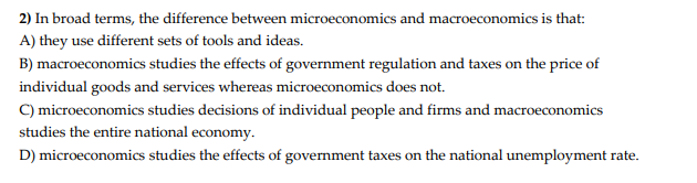 | B | Macroeconomics studies effects of regulation/taxes on prices of individual goods, micro does not. | False | Microeconomics studies individual prices and taxes too. |