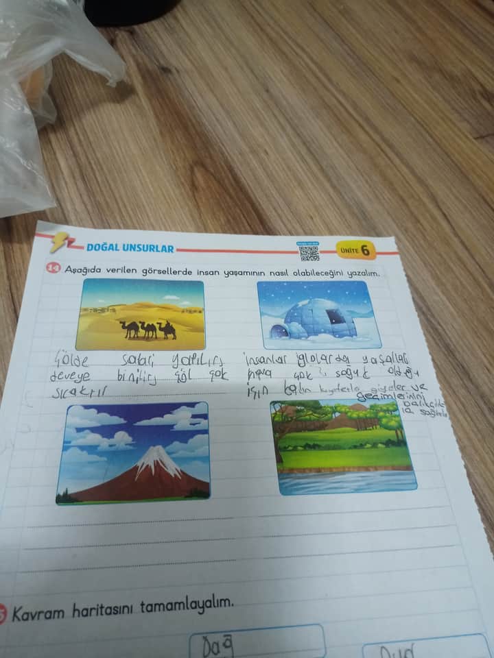 Bu sayfadaki alıştırmada dört farklı görsel sunulmuştur: çöl, kutup (iglo), dağ ve orman/göl çevresi. Her birinde insanların yaşam biçimleri, geçim kaynakları, ev tipleri ve giyim şekilleri farklı olabilir. Aşağıda, bu farklı ortamlarda insanların nasıl yaşadıklarını ve ne tür önlemler aldıklarını inceleyeceğiz.