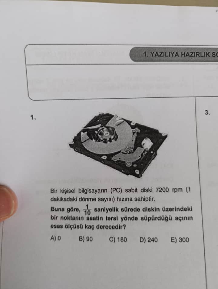 Bir kişisel bilgisayarın sabit diski 7200 rpm hızında dönüyor. Buna göre, 1/10 saniyelik sürede diskin üzerindeki bir noktanın saat yönünün tersi yönünde süpürdüğü açı kaç derecedir?