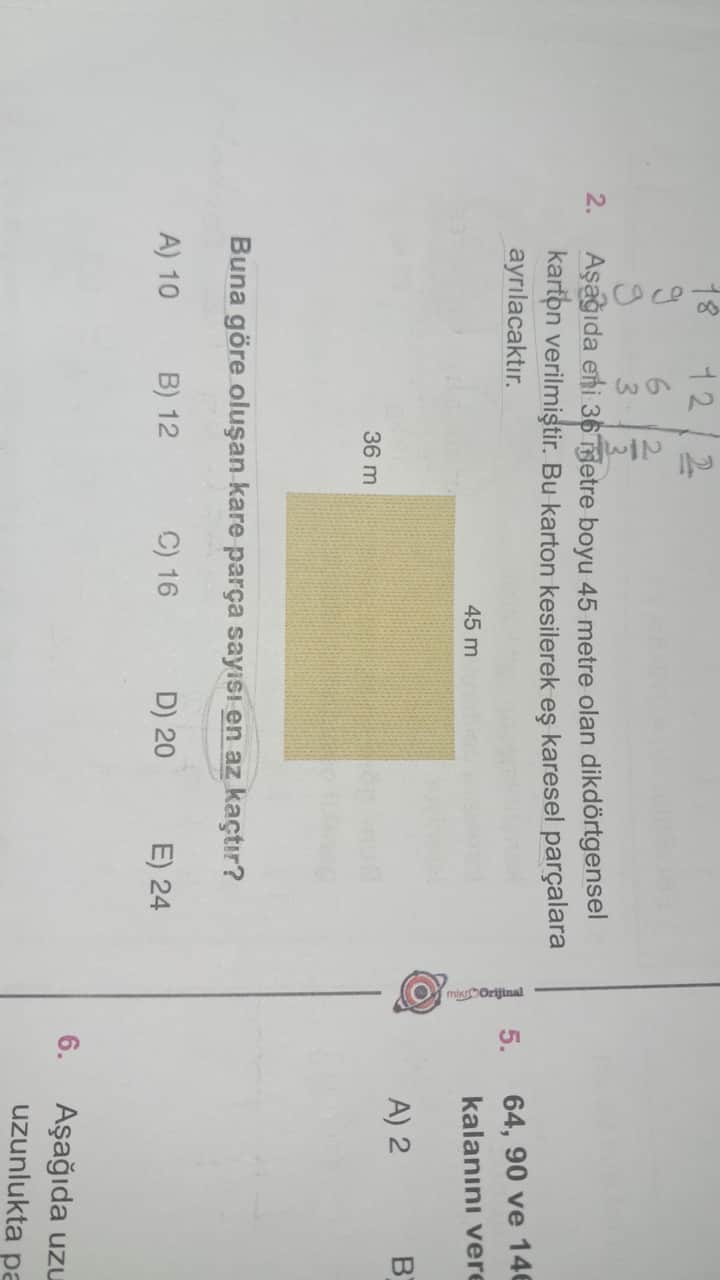 Soru: Aşağıda eni 36 metre, boyu 45 metre olan dikdörtgensel karton verilmiştir. Bu karton kesilerek eş kare parçalara ayrılacaktır. Buna göre oluşan kare parça sayısı en az kaçtır?