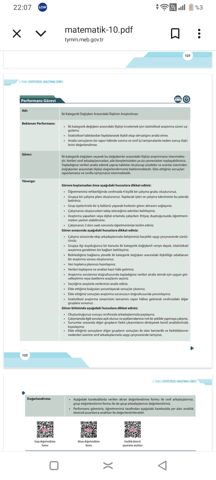 Gönderdiğiniz görsel, Türkiye Milli Eğitim Bakanlığı’nın 10. sınıf matematik müfredatına ait bir “Performans Görevi” yönergesini içermektedir. Bu performans görevi, “İki Kategorik Değişken Arasındaki İlişkinin Araştırılması” konusunu kapsamaktadır. Görselde, bu görevin amacı, yapılması gerekenler, dikkat edilmesi gereken hususlar ve değerlendirme kriterleri detaylı şekilde açıklanmıştır.