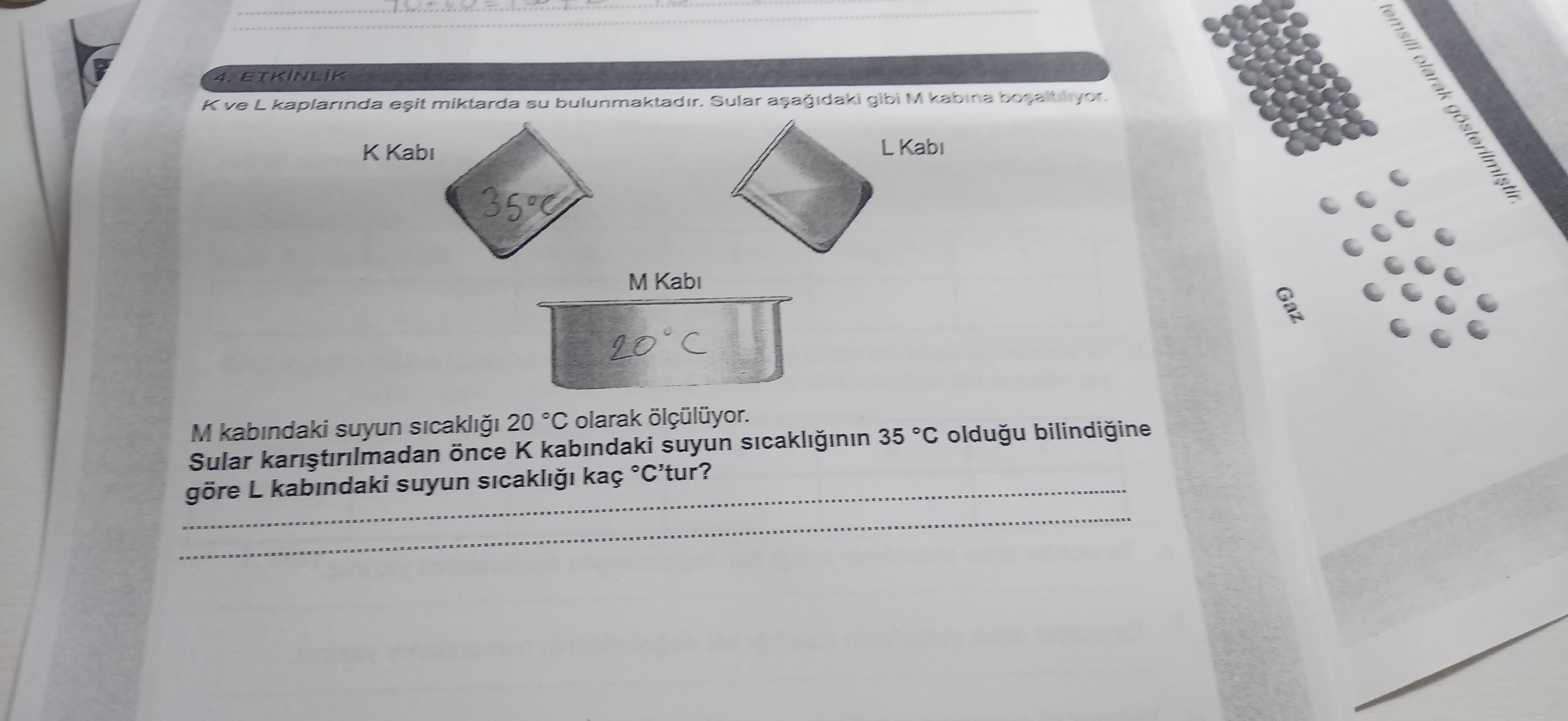 • K kabındaki suyun sıcaklığı 35 °C, L kabındaki suyun sıcaklığı bilinmemektedir.