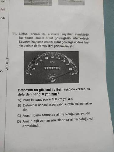 Defne’nin gözlemi, aracın hız göstergesindeki ibrenin konumunun değişmediğini gösterir. Bu durum, aracın sabit bir hızla hareket ettiğini gösterir.