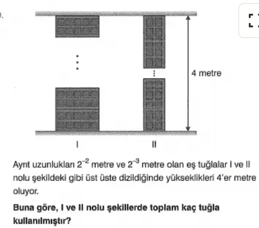 Resimdeki bilgilerden tuğla ayrıt uzunlukları sırasıyla 2^{-2} m ve 2^{-3} m yani 1/4 m ve 1/8 m’dir. Her iki şeklin yüksekliği 4 m olduğuna göre kat sayıları ve kat başına düşen tuğla sayıları şu şekilde hesaplanır: