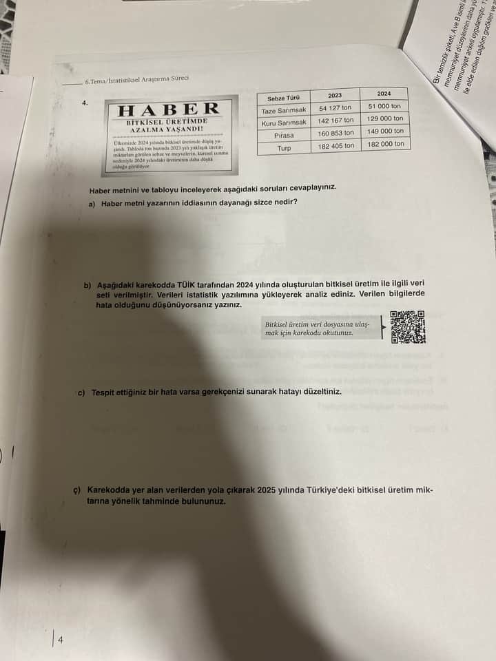 Bu soru, bir gazete haberindeki “Bitkisel üretimde azalma yaşandı!” başlıklı metin ve yanında sunulan 2023-2024 yıllarına ait bazı sebze üretim verileri üzerinden, istatistiksel bir inceleme yapmayı amaçlıyor. Soru maddeleri; haber iddiasının dayanağını yorumlamayı, TÜİK’in 2024 verilerinde olası tutarsızlıkları belirlemeyi, bir hata varsa bunu düzeltmeyi ve nihayetinde 2025 yılına dair bir üretim tahmini oluşturmayı içeriyor.