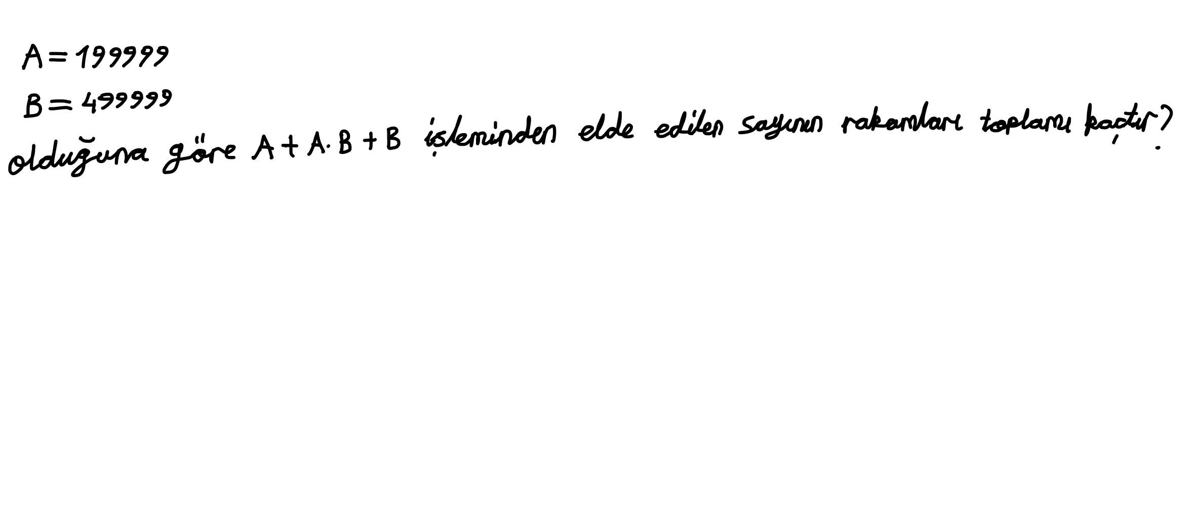 A = 199999, B = 499999 olduğuna göre A + A·B + B işleminden elde edilen sayının rakamları toplamı kaçtır?