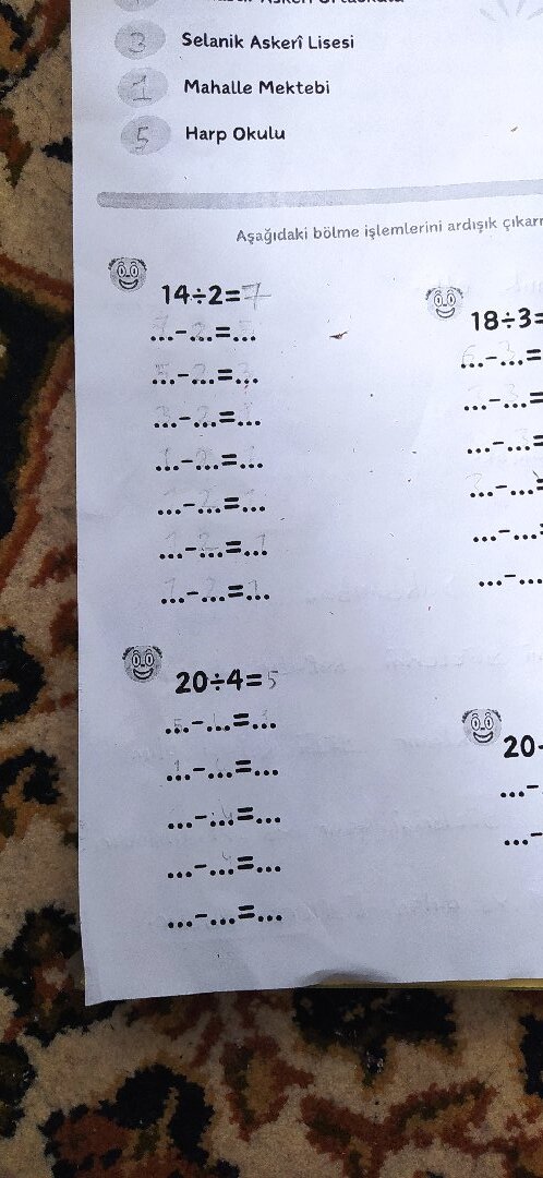 Selanik Askeri Lisesi Mahalle Mektebi Harp Okulu çalışma kitabındaki bu bölüm soruları, ardışık çıkarma yöntemiyle çözülerek bölme işlemini pekiştirir. Resimdeki uzun bölme şablonlarında, sayılar (14 ÷ 2, 20 ÷ 4 = 5, 18 ÷ 3 ve 20 ile ilgili bir işlem) kısmen verilmiş; boşluklar adımları doldurmak için tasarlanmış. Her işlemde, böleni ardışık olarak çıkararak sıfıra ulaşırız. Bu, bölme = tekrarlı çıkarma ilkesine dayanır ve kalan 0 ise tam bölünme gerçekleşir (Kaynak: MEB Matematik Müfredatı, 2024).