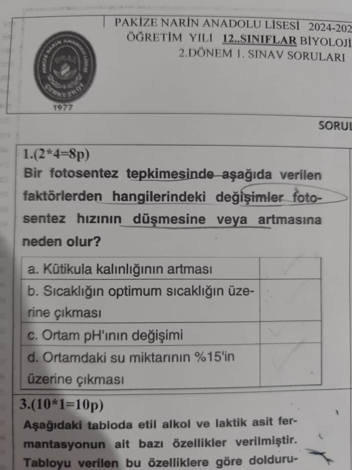 Özetle, soruda belirtilen tüm faktörlerdeki değişimler (kütikula kalınlığı, sıcaklığın optimumun üstüne çıkması, pH değişimi ve ortamın su miktarı) fotosentez hızını çeşitli şekillerde azaltabilir veya artırabilir. Bunların her biri uygun dengeyi koruduğu sürece fotosentez için fayda sağlarken, uç değerlere çıkıldığında ya da uygun tolerans sınırı aşıldığında fotosentez hızında düşüşe neden olur.