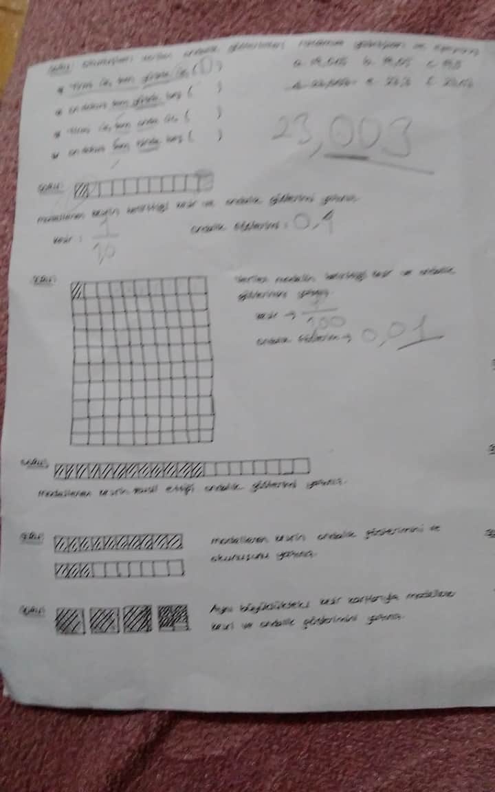 Eğer 23,003’te tam kısım için 23 bütün kare, kesir kısım için 1000 küçük parça gibi bir görsel hazırlanırsa: