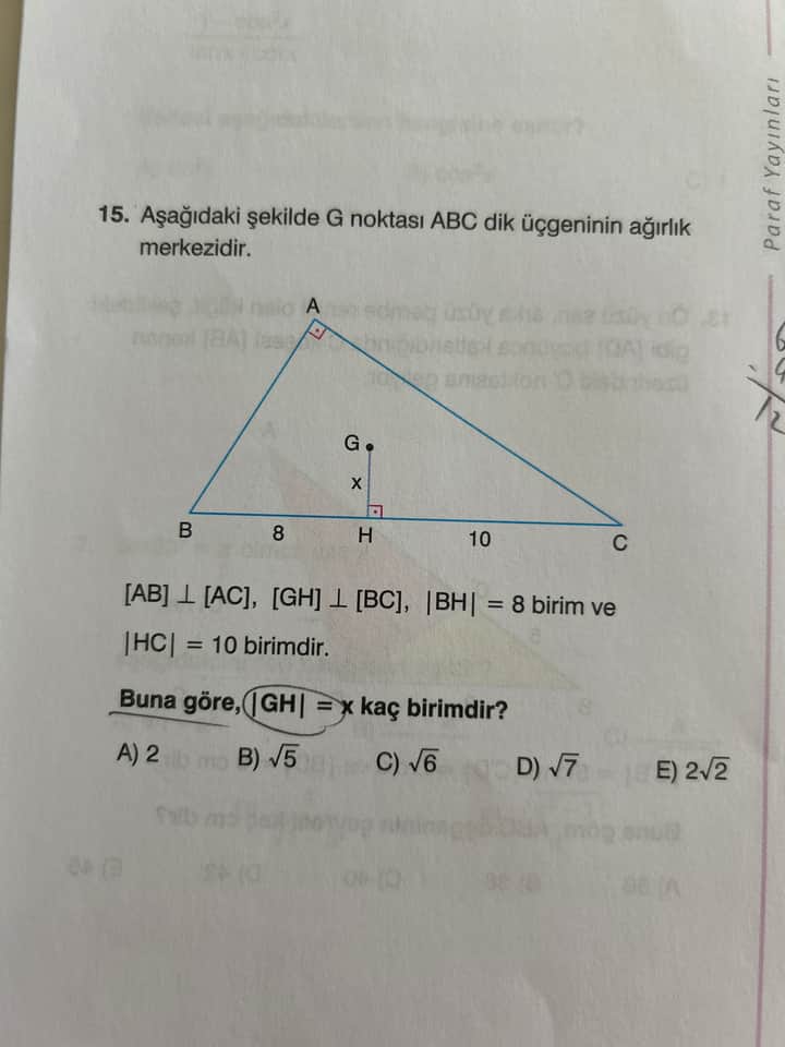 Soru 15 n: Aşağıdaki şekilde G noktası ABC dik üçgeninin ağırlık merkezidir. Buna göre, |GH| = x kaç birimdir?