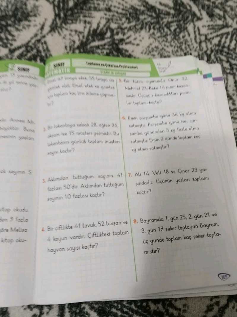 en fala äne Melsg SINE Teetamave ika oktentat e Enel elet ve gomtak lokany sabah 28, 8alen 36 akyam se 15 magtert gelmiştir Bu lokantanin ganlok toplam mojteri br Oonon kaandtan puon lar topta kotr? 6 Emin (orsonbo gonu 34 g eimo sotmte Pergembe gono se, ar sombo gononden 3 kg fozlo elmo sotmgtrr Emin 2 gonde toplom kos kg elma satmst? LAklmdan tuttugum sayinin 41 fozlas 50’dir Akimdan tuttuğum soyinin 1O fazlası kaçtır? 7. Ali 144, Vell 18 ve Cinar 23 ya- sndadır Uçünün yaglar toplami kactr? 4 Bir ciftlkte 41 tavuk. 52 tavşan ve8. 4 koyun vardır. Ciftlikteki toplam hayvan sayisı kaçtır? Bayramda 1. qün 25, 2. gün 21 ve 3. qún 17 şeker toplayan Bayram. üç günde toplam kaç şeker topla- miştır? 1652