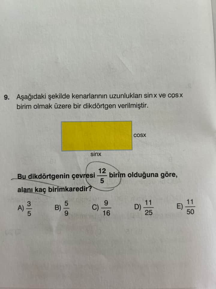 Soru 9 b: Aşağıdaki şekilde kenarlarının uzunlukları sin x ve cos x birim olmak üzere bir dikdörtgen verilmiştir. Bu dikdörtgenin çevresi \frac{12}{5} birim olduğuna göre, alanı kaç birimkaredir?