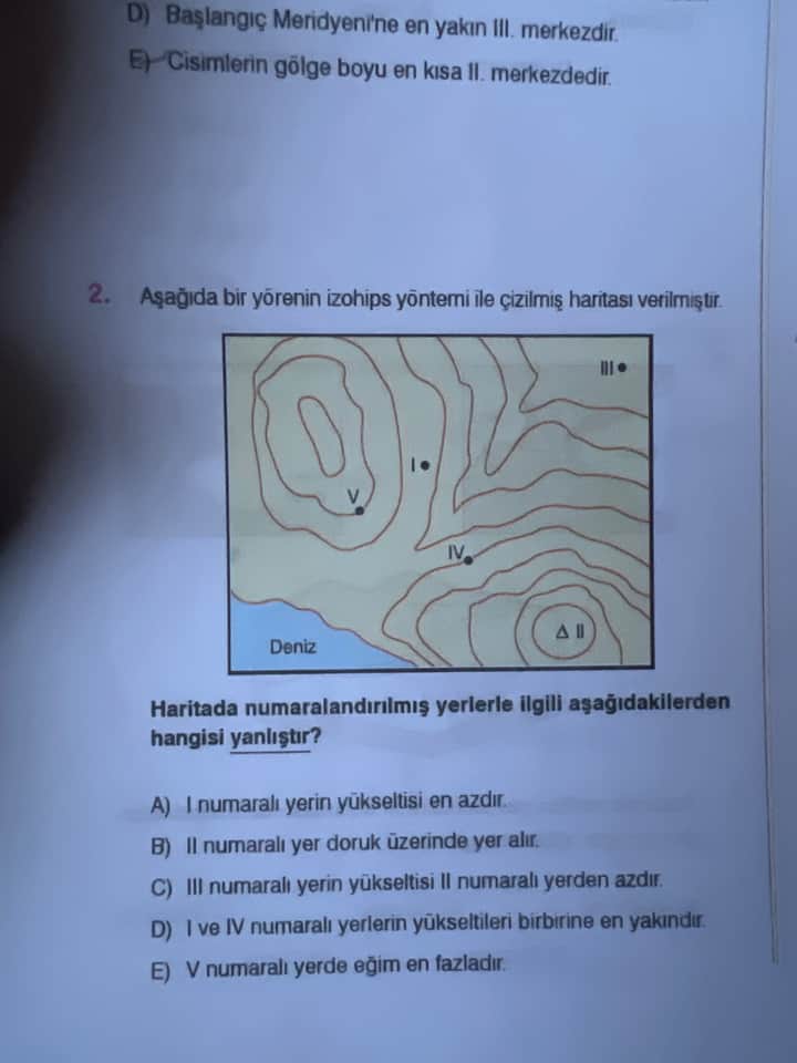 | E) V numaralı yerde eğim en fazladır. | Doğru | Çizgiler çok sık, eğim yüksek. |