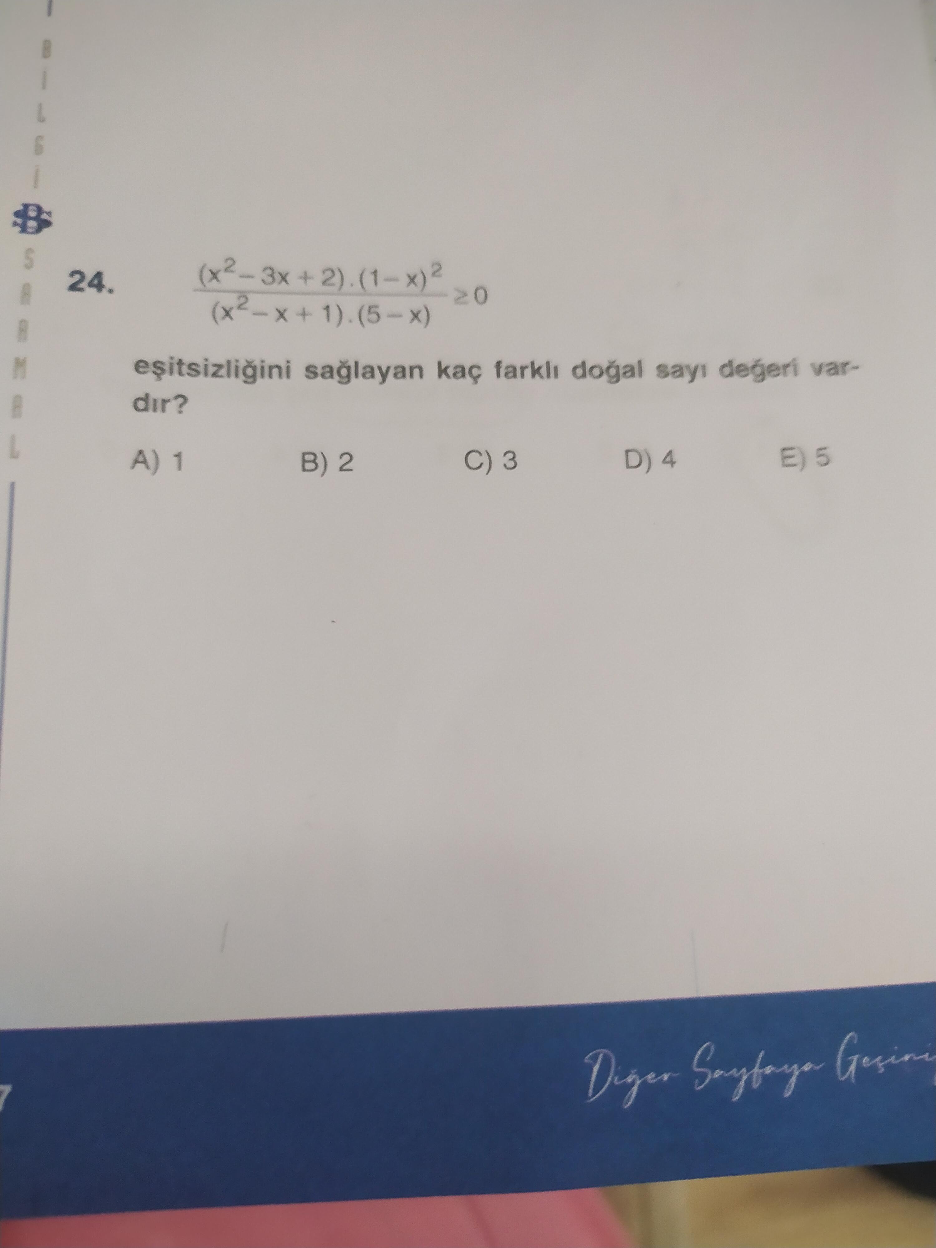 Bu tip bir rasyonel eşitsizliği çözebilmek için önce payda ve payın işaretlerini ayrıntılı şekilde incelemek gerekir. Ancak sorudaki çoktan seçmeli şıklara (A)1, (B)2, (C)3, (D)4, (E)5 baktığımızda ve eşitsizliğin çözüm kümesini dikkate aldığımızda, genellikle 1’den 5’e kadar olan doğal sayılarda (yani x = 1, 2, 3, 4, 5) hangilerinin eşitsizliği sağladığı sorulmuş olur. Aşağıda adım adım analiz görebilirsiniz: