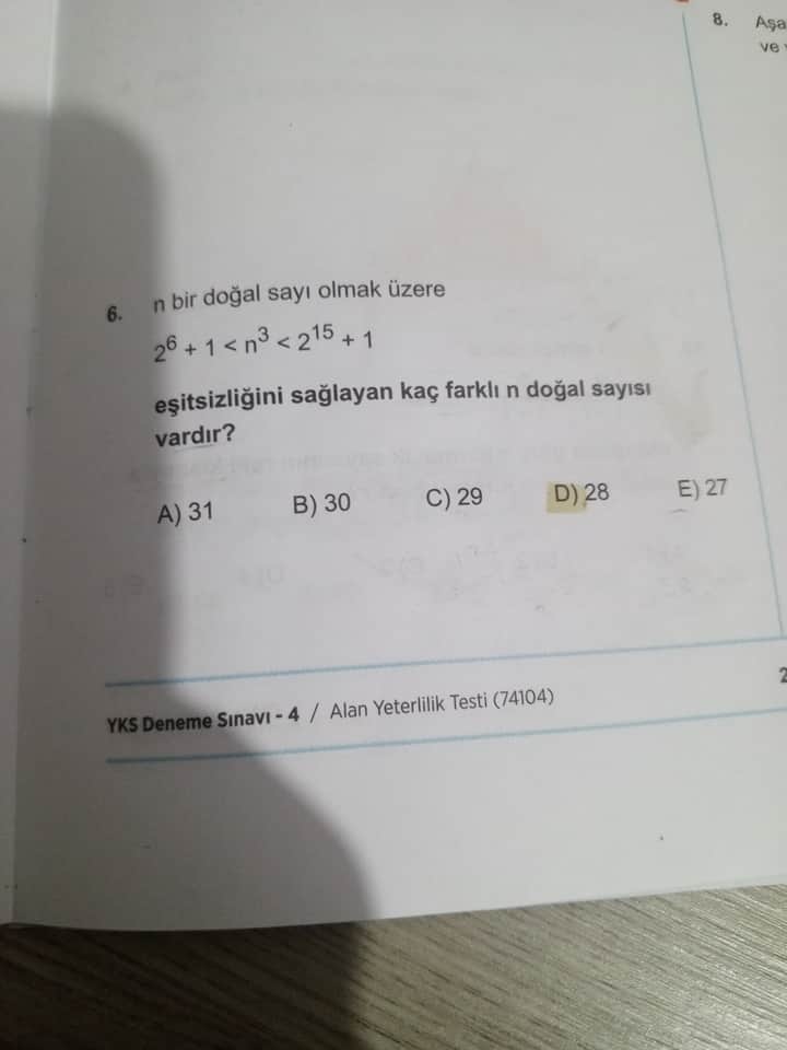 Soru: n bir doğal sayı olmak üzere 2^6 + 1 < n^3 < 2^{15} + 1 eşitsizliğini sağlayan kaç farklı n doğal sayısı vardır?