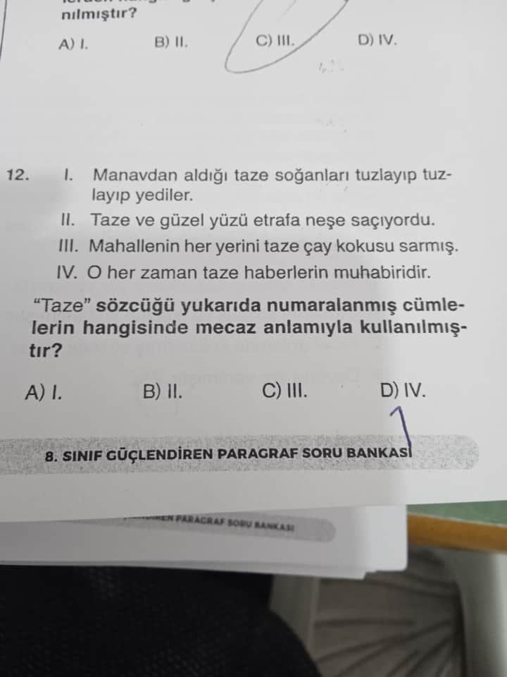 Sonuç olarak, mecaz anlamıyla kullanılan cümle (IV) numaralı cümledir. Doğru cevap D) IV’dir.