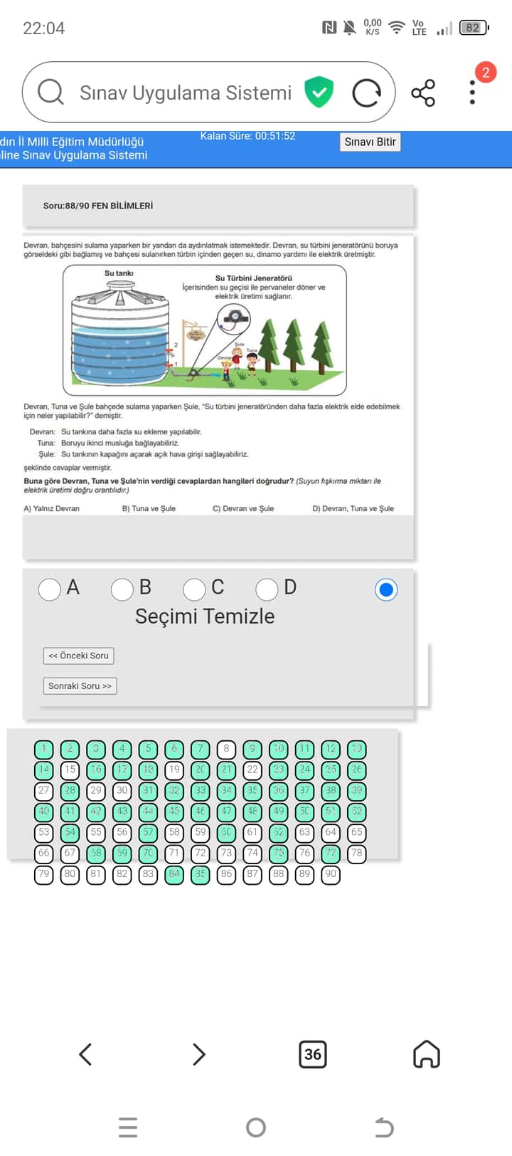 | Şule | Su tankı kapağını açarak açık hava girişi sağlama | Yanlış | Türbin suyun akışına bağlı, hava girişi doğrudan elektrik üretimini artırmaz. |