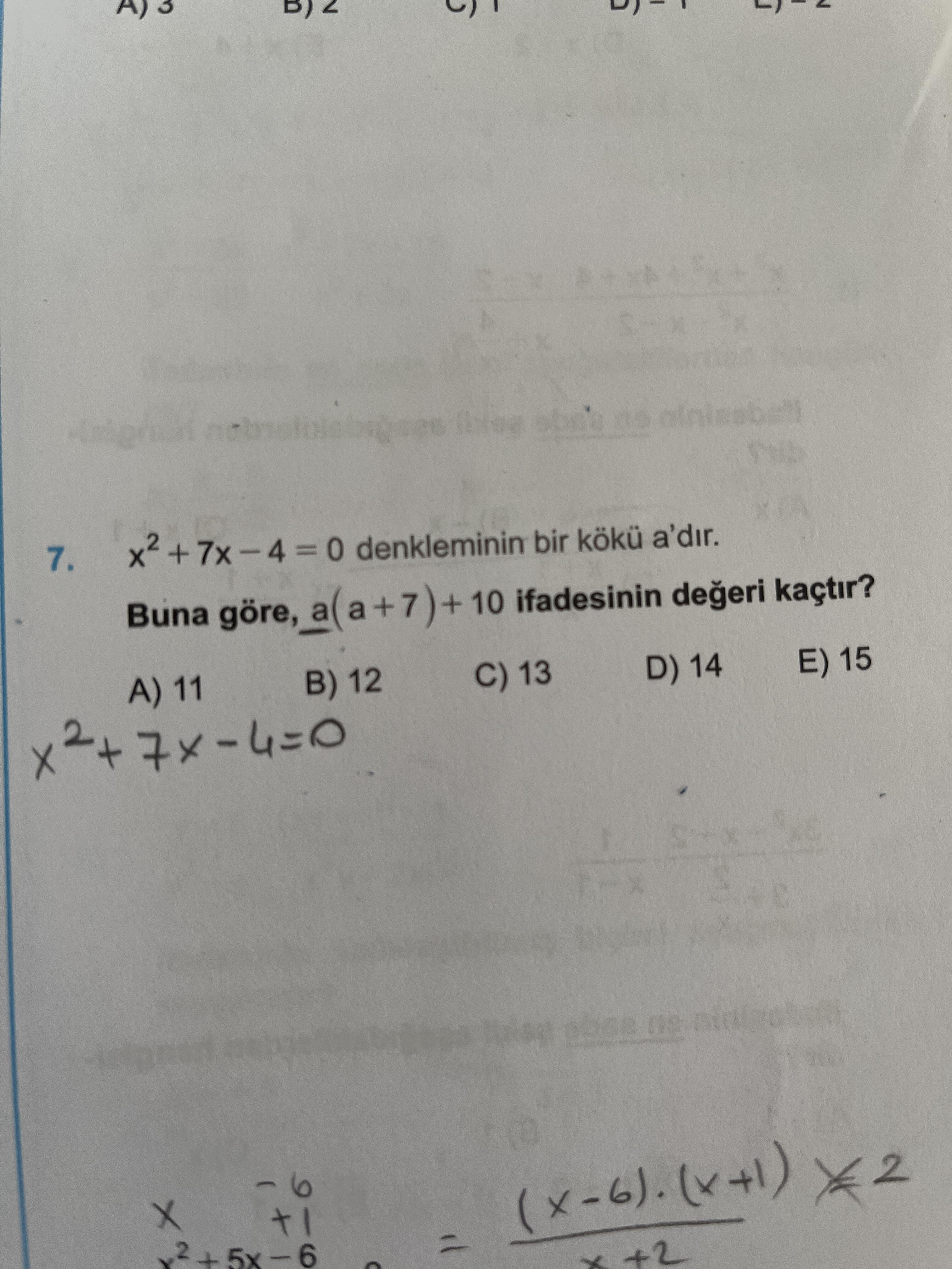 Soru: x² + 7x − 4 = 0 denkleminin bir kökü a ise, a(a + 7) + 10 ifadesinin değeri kaçtır?