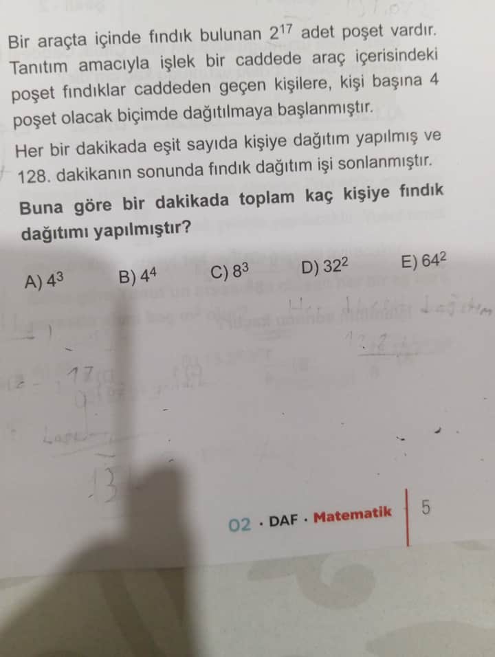 128 dakikanın sonunda toplam 2^{15} kişiye dağıtılmışsa, her dakika dağıtılan kişi sayısı y ise: