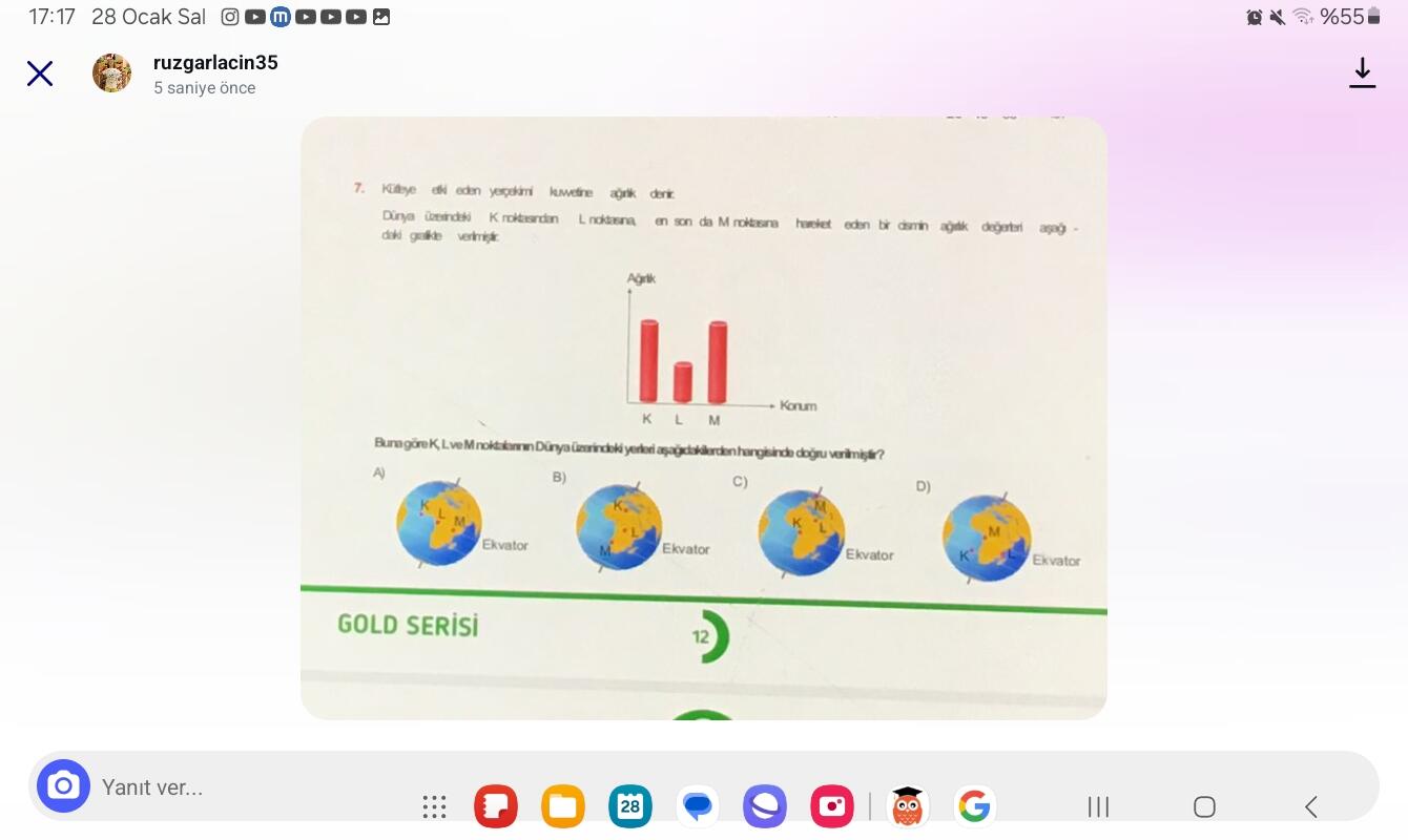 Resimde yer alan soruya göre, “Kütleye etki eden yerçekimi kuvvetine ağırlık denir. Dünya üzerindeki K noktasından L noktasına, en son da M noktasına hareket eden bir cismin ağırlık değeri aşağıdaki grafikte verilmiş.” Buradan grafikte K, L, M sıralı ağırlık değerleri verilmiş. Bu durumda düşünülmesi gereken şey Dünya üzerindeki yerçekimi kuvvetinin değişkenliğidir.