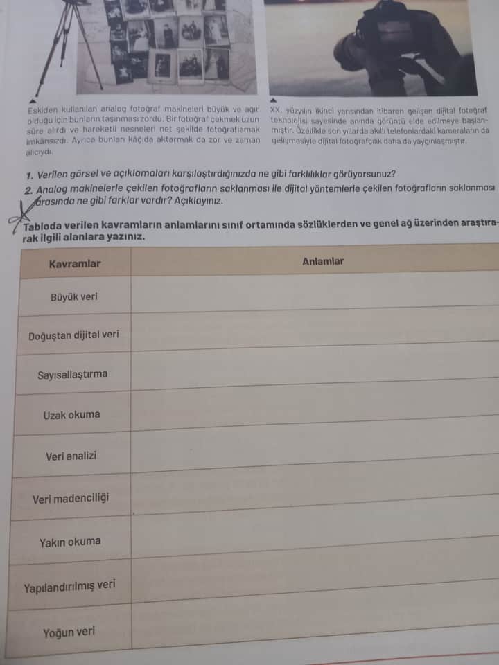 - Analog fotoğraf makineleriyle çekilen fotoğraflar: Fiziksel ortamda (kağıt gibi) saklanır, ağır ve taşınması zordur, fotoğraf çekme süresi uzun, hareketli objelerde net çekmek zor.