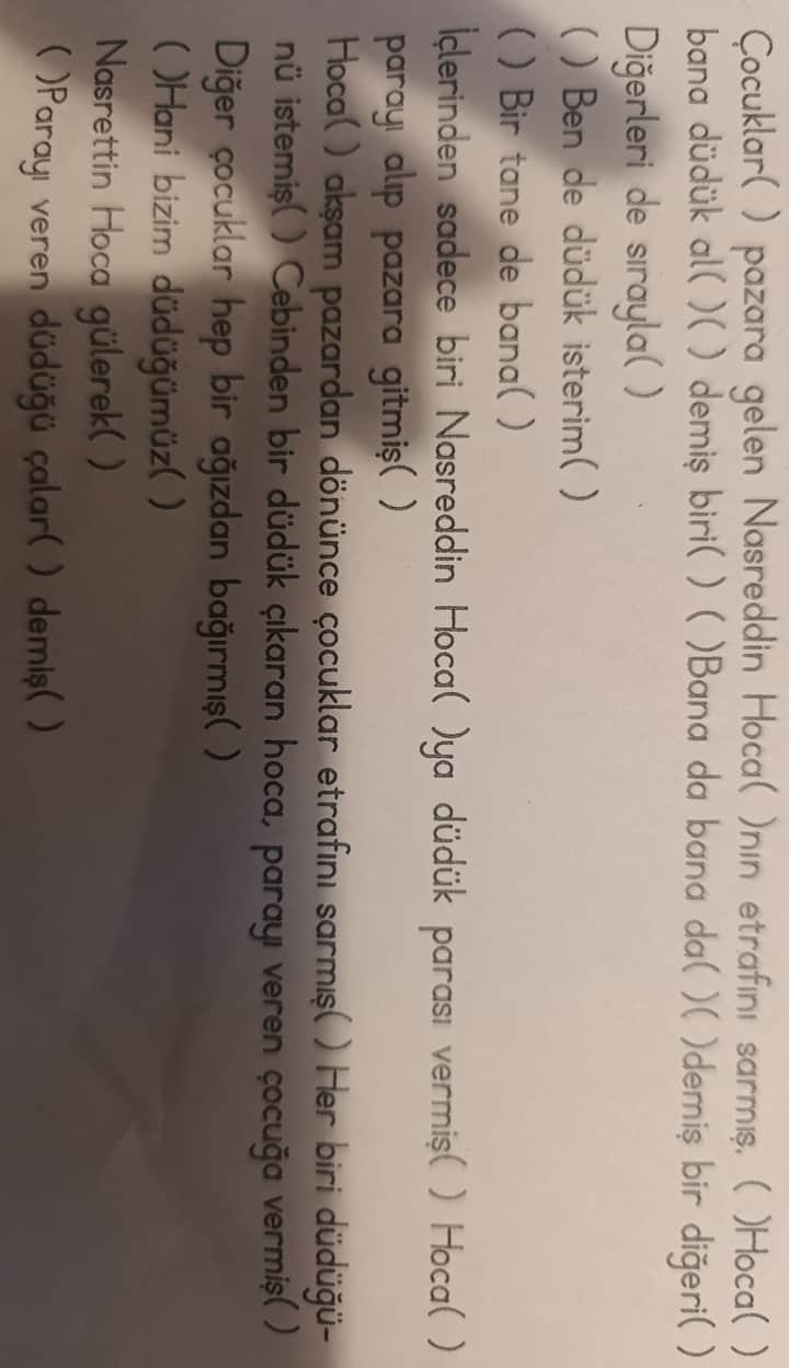 Soruda verdiğiniz resimde, Nasreddin Hoca ile ilgili kısa bir metin bulunuyor. Bu metinde virgüller, tırnak işaretleri, nokta, kesme işareti ve soru işareti gibi pek çok noktalama işareti eksik görünüyor. Ayrıca özel isim olan Nasreddin Hoca yazılırken doğru şekilde ayrılmalı ve ekler 'nın, 'ya vb. kesme işaretiyle ayrılmalıdır. Konuşma cümlelerini belirtmek için tırnak veya kısa çizgi (—) kullanılmalı, seslenmelerde ünlem işareti eklenmelidir.