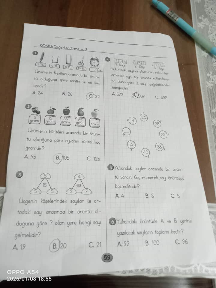 (Fakat seçeneklerde 5 yok; cevabı öğrenci B 20 olarak işaretlemiş.)