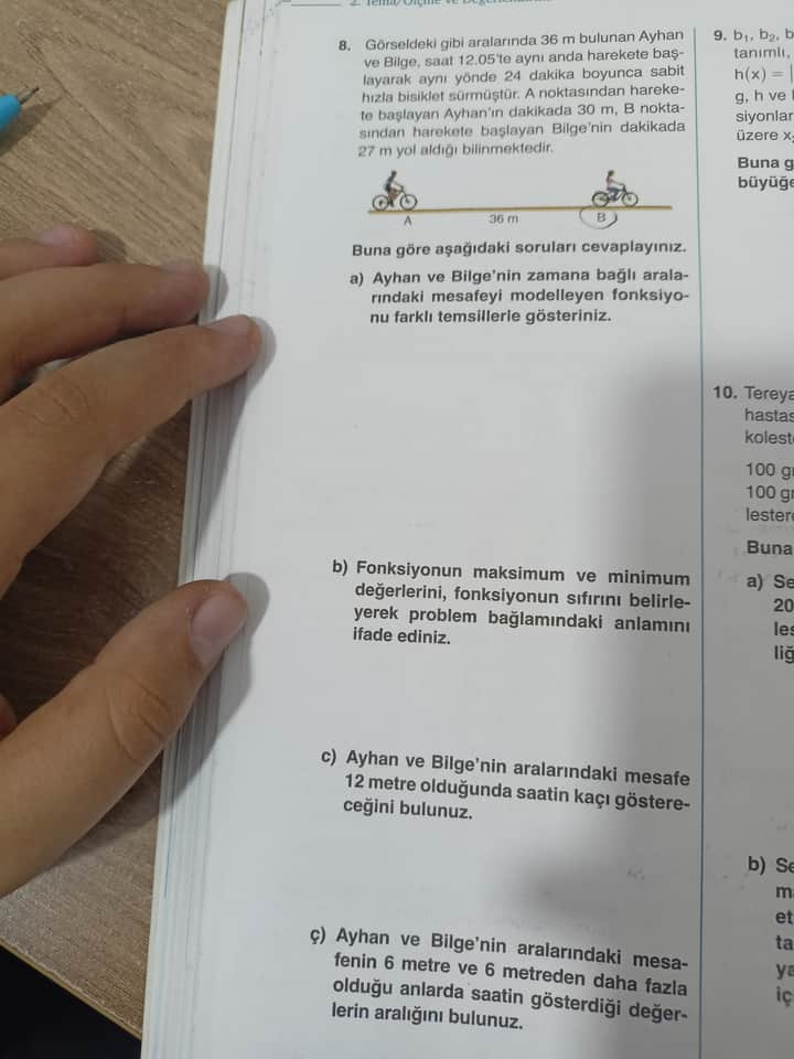 Görseldeki gibi aralarında 36 m bulunan Ayhan ve Bilge, saat 12:05’te aynı anda harekete başlayarak aynı yönde 24 dakika boyunca sabit hızla bisiklet sürmüştür.