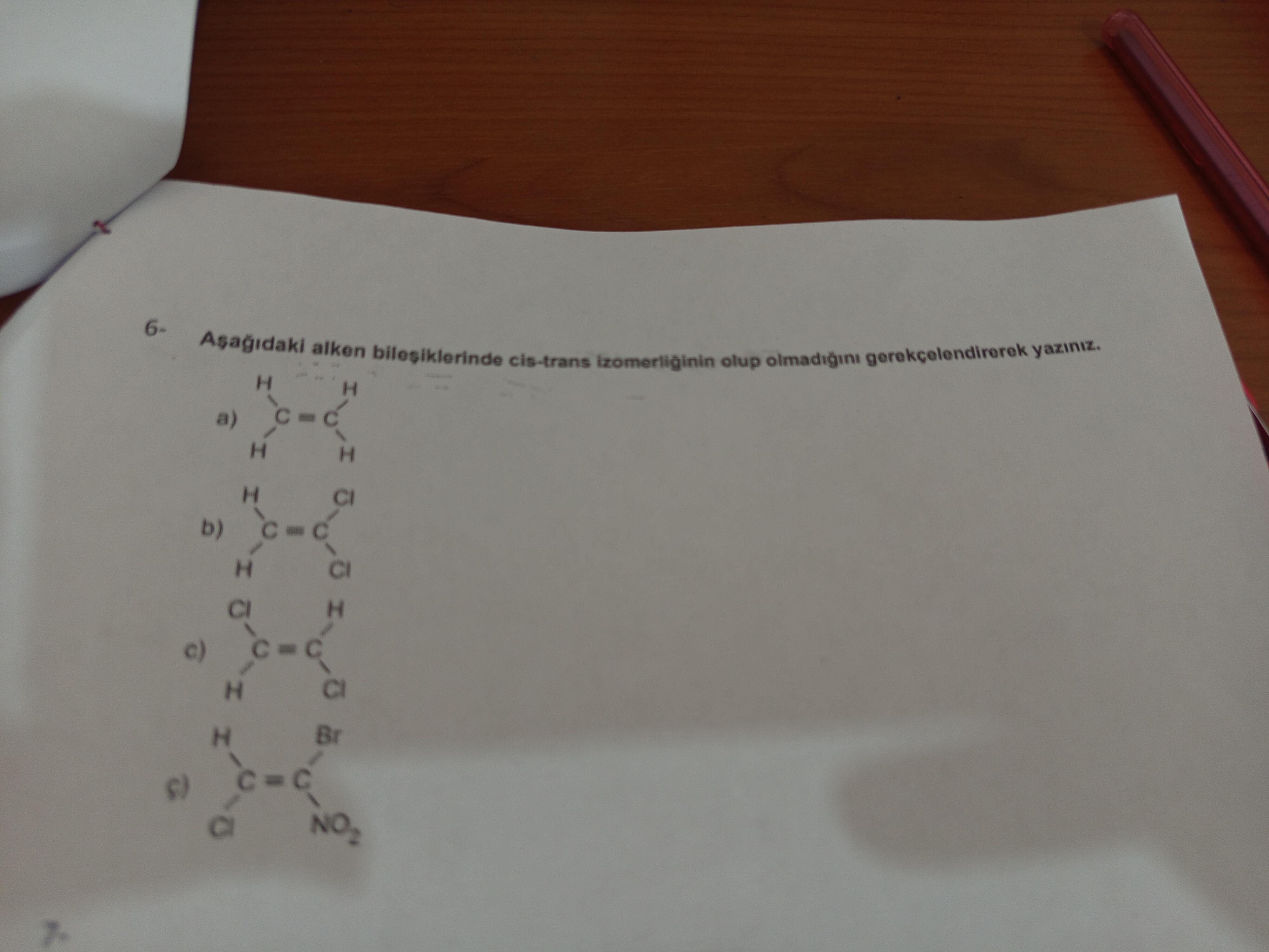 6- Aşağıdaki alken bileşiklerinde cis-trans izomerliğinin olup olmadığını gerekçelendirerek yazınız.