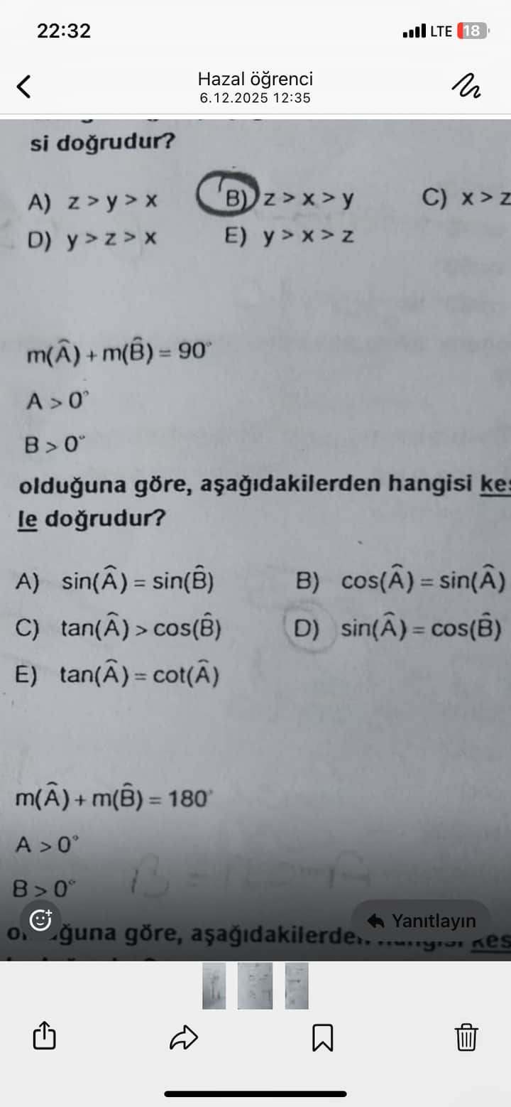 Özet: kesin doğru olanlar D (\sin A=\cos B) ve mantıksal olarak C (\tan A>\cos B) de tüm verilen şartlar altında doğrudur. Eğer tek şık seçilecekse ve sınav bağlamında “özdeşlik / kimlik” soruluyorsa D en doğrudur.