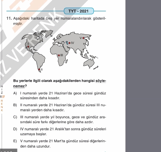 Bu soruda harita üzerindeki beş noktanın (I, II, III, IV, V) coğrafi konumlarına ve yıl içindeki gündüz-gece sürelerine bakılarak hangisinin yanlış olduğu bulunmalı.