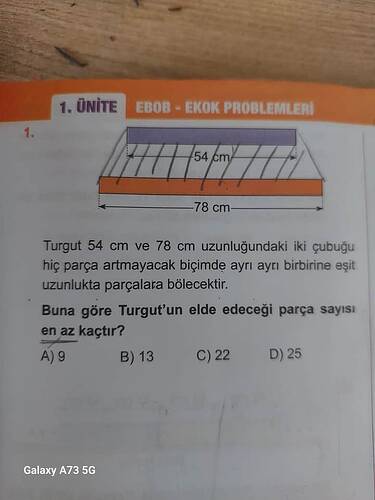 Merhaba! Bu problemde elimizde iki farklı uzunlukta çubuk bulunuyor: biri 54 cm, diğeri 78 cm. Bu iki çubuğu da “artmayacak” şekilde, yani arta kalan parça olmadan, eşit uzunluklu daha küçük parçalara bölmek istiyoruz. Sorunun bizden istediği, bu durumda en az toplam parça sayısının kaç olduğudur. Kısaca anlatmak gerekirse, önce iki çubuğu en uzun eşit parçalara bölebilmek için EBOB (En Büyük Ortak Bölen) kavramını kullanacağız. Sonrasında, her bir çubuğun o EBOB uzunluğundaki parçalara ayrılmasından oluşan toplam parça sayısını toplayacağız.