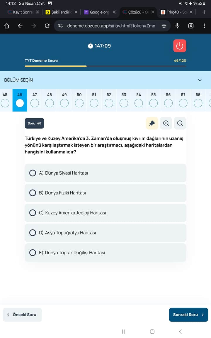 - Türkiye ve Kuzey Amerika karşılaştırması için ‘dünya jeoloji haritası’ daha uygundur fakat seçenekler arasında en yakın olan budur çünkü dağ oluşum dönemini ve uzanışını verir.