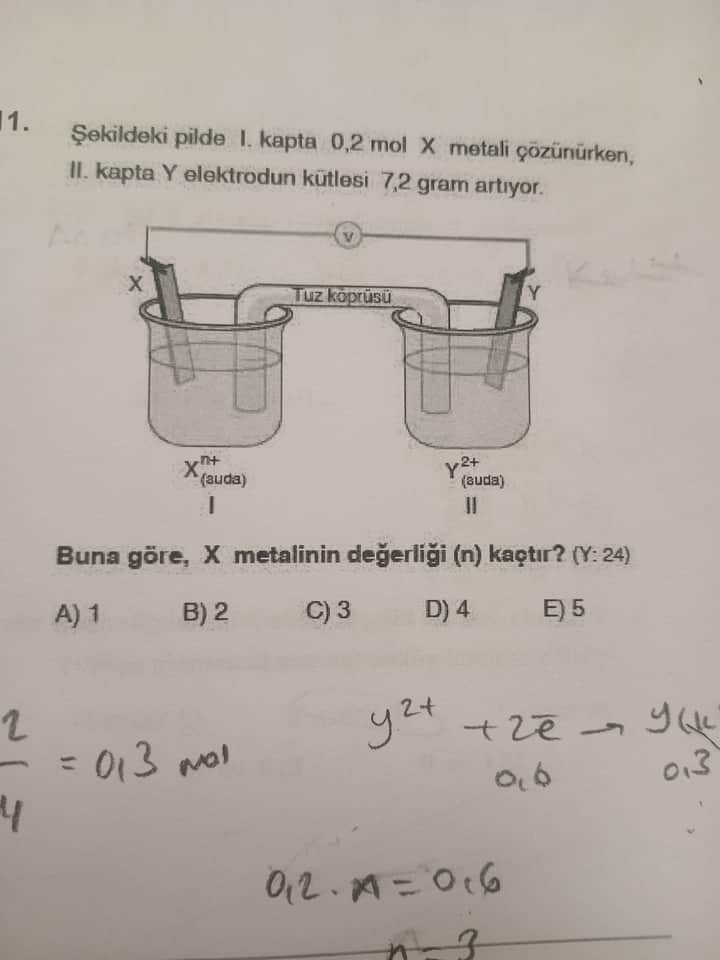 n_{Y}=\dfrac{7{,}2}{24}=0{,}3\ \text{mol}. - Her Y atomu için 2 elektron gerekir ( Y^{2+}+2e^-\to Y ), dolayısıyla toplam elektron tüketimi: