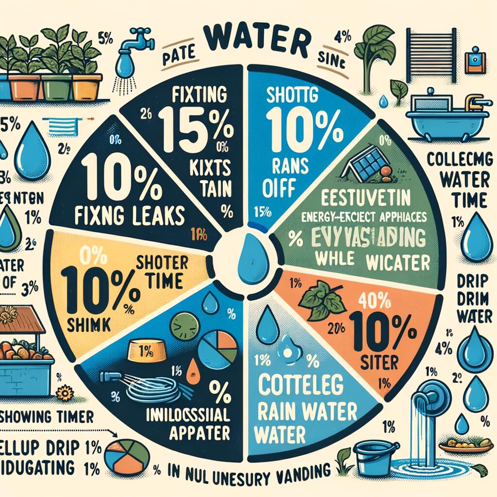 A pie chart depicting water-saving actions with corresponding percentages: 15% for fixing leaks, 15% for keeping the tap closed while washing, 10% for energy-efficient appliances, 10% for rainwater collection, 20% for shortening shower durations, 10% for efficient fruit and vegetable washing, 10% for avoiding unnecessary water usage, and 10% for using drip irrigation in farming. Simplified labels are added for action clarity.